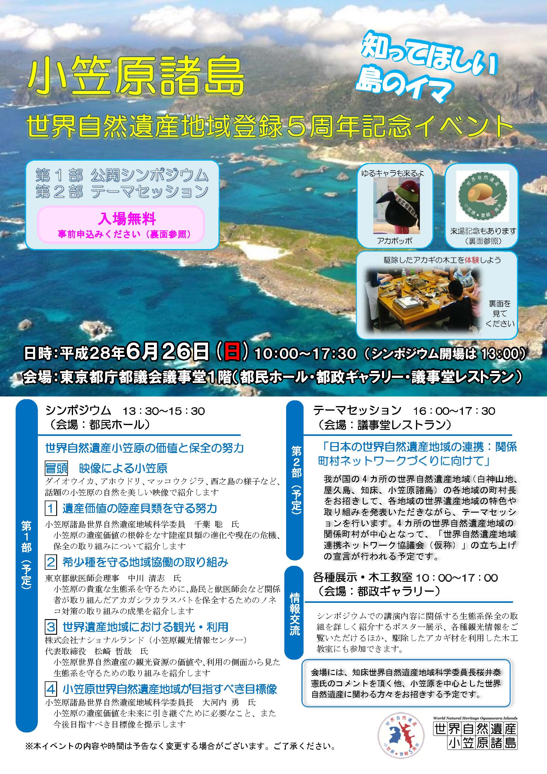 小笠原が世界自然遺産に登録されてから、5周年を迎えるにあたり、6/26(日)に都庁のホール等で、記念イベントが開催されます。