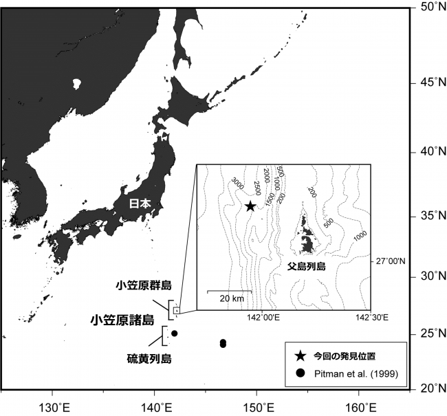 小笠原諸島周辺海域では、1999年に公表された論文(Pitman et al. 1999)において、硫黄列島以南での発見記録が3件報告されていますが、今回の発見は、それ以降における新たな記録であるとともに、小笠原群島周辺海域での初めての確実な発見記録となりました。