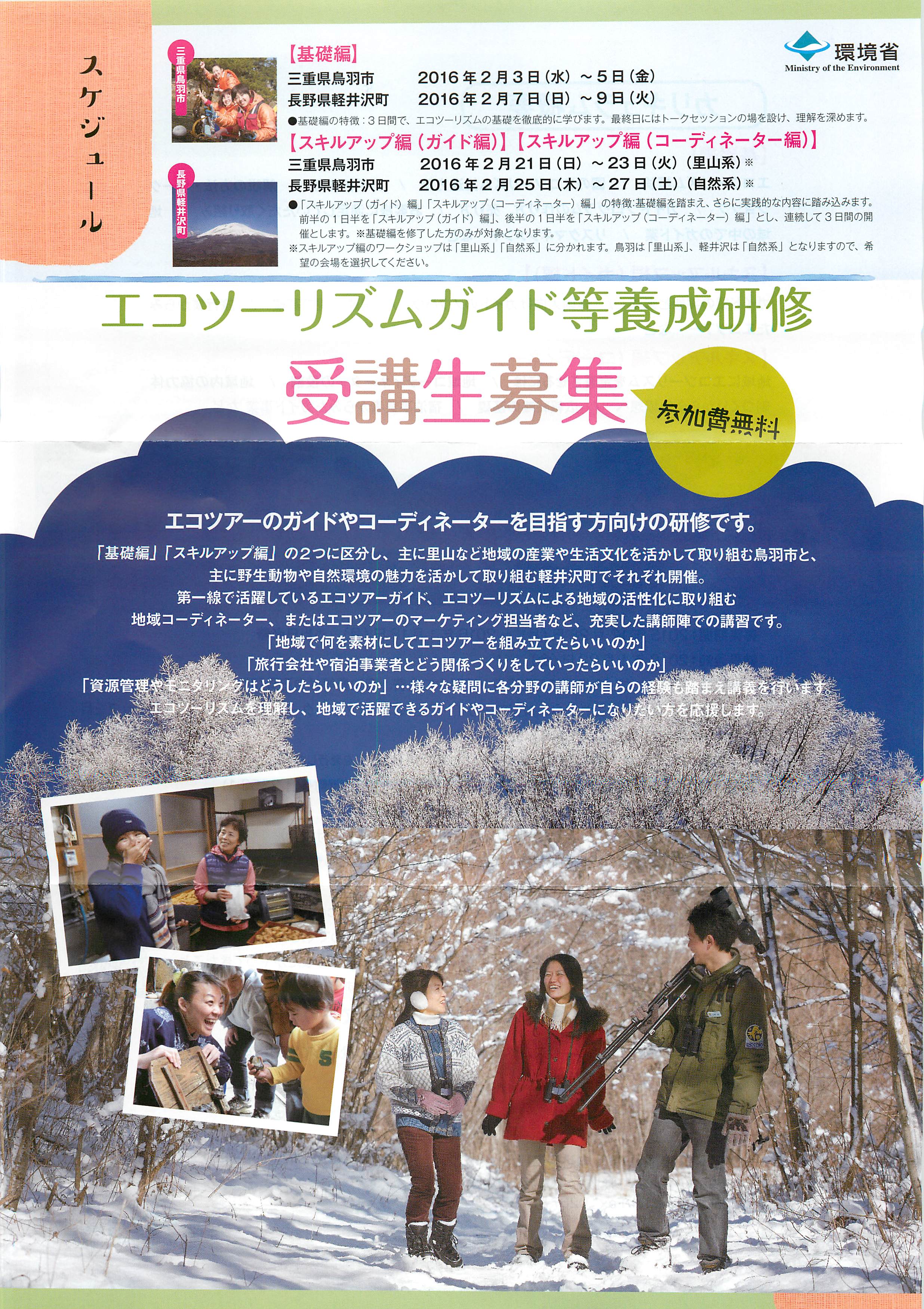 募集期間: 2015 年12 月28 日(月)~ 2016 年1 月18 日(月) ※当日必着 結果通知: 2016 年1 月22 日(金) 応募方法: 小論文を800 字以内にまとめ提出。詳細は下記、日本エコツーリズム協会のサイトからご確認ください。